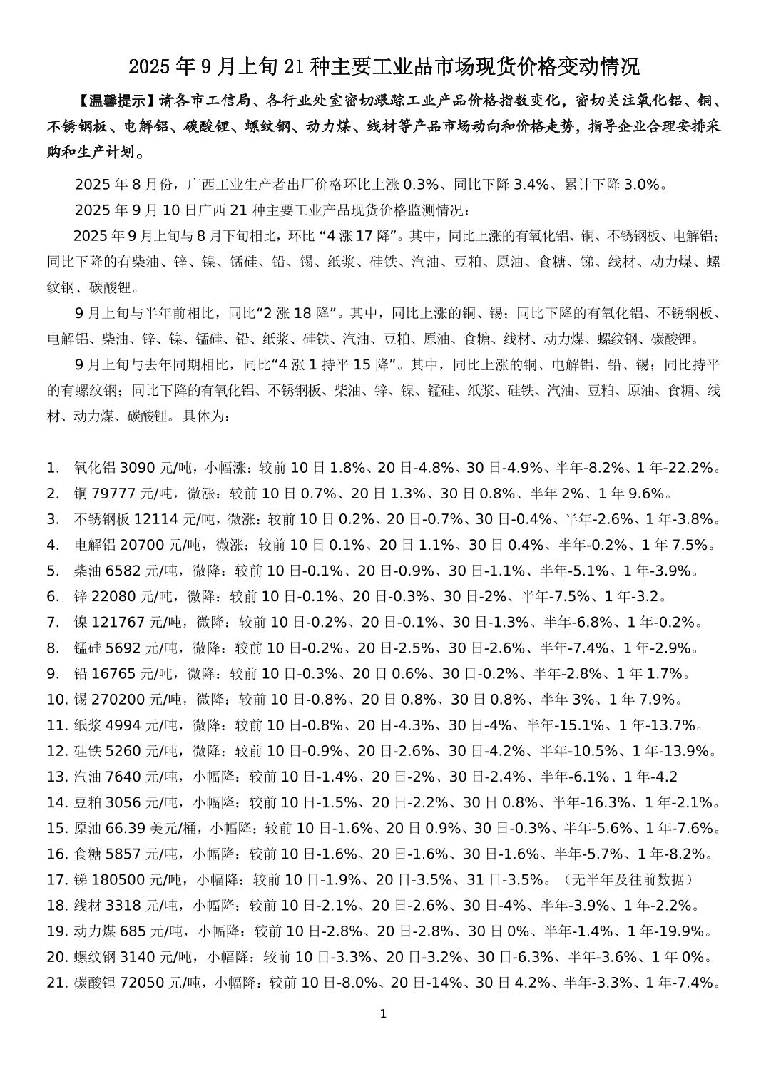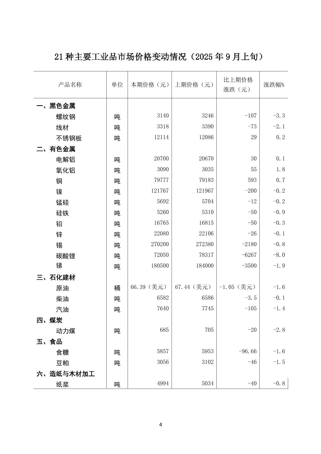 2025年9月上旬21种主要工业品市场现货价格变动情况