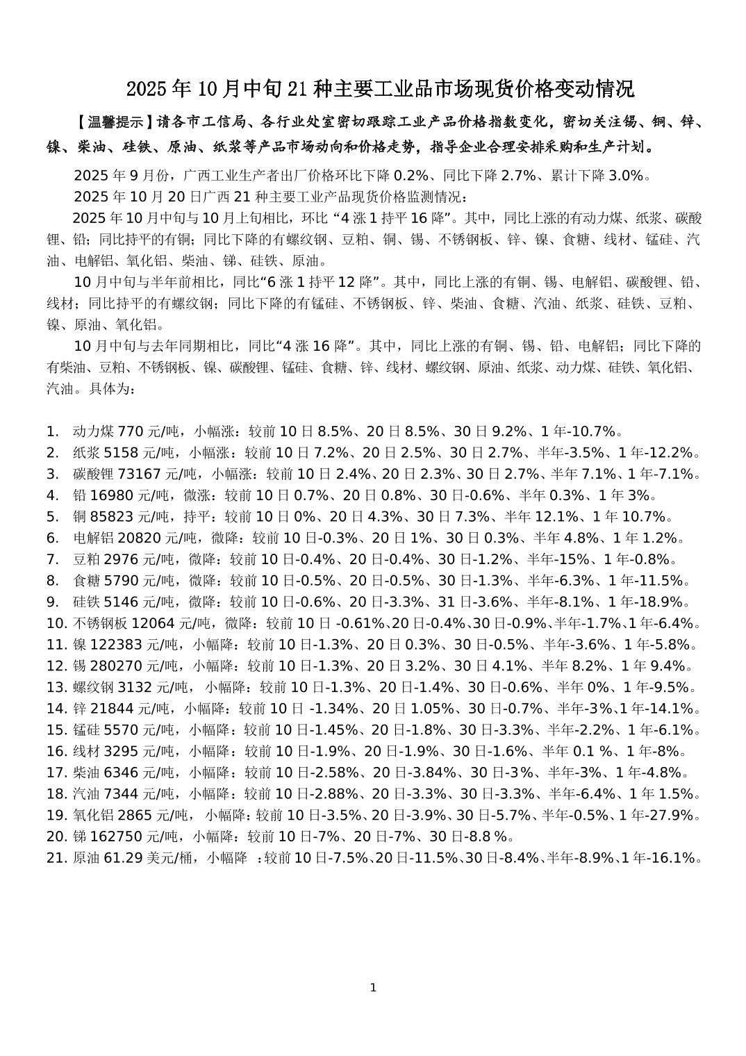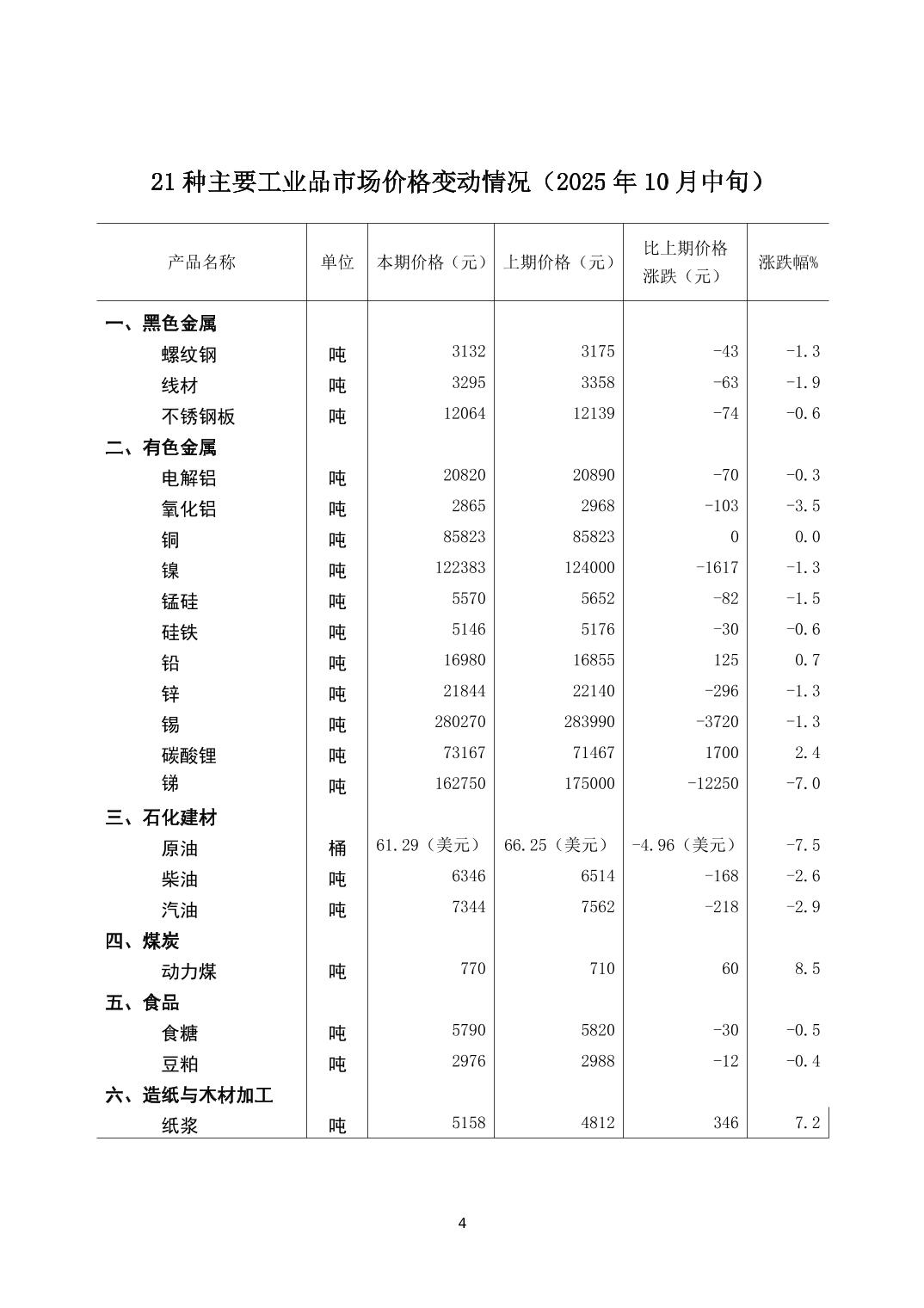 2025年10月中旬21种主要工业品市场现货价格变动情况