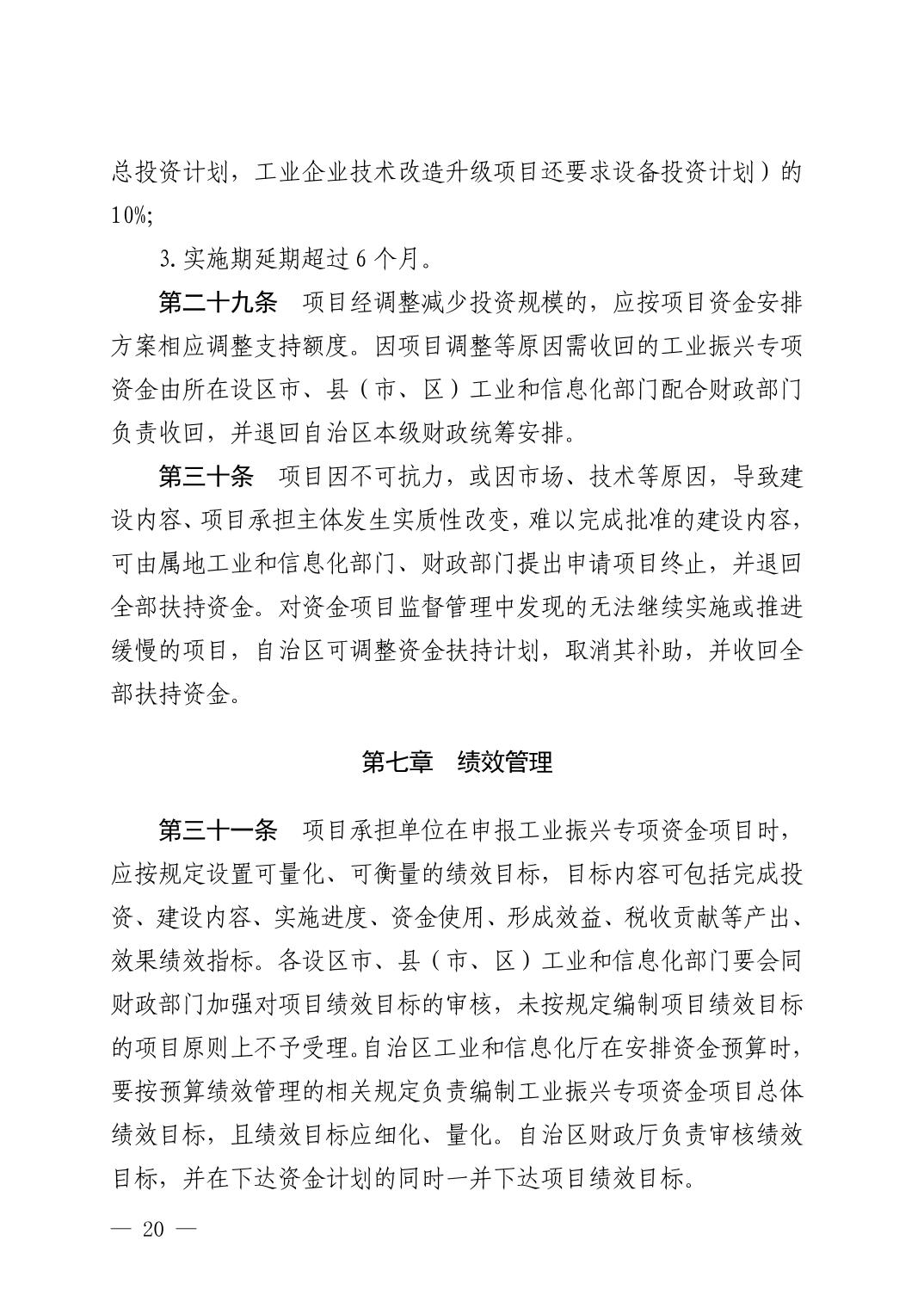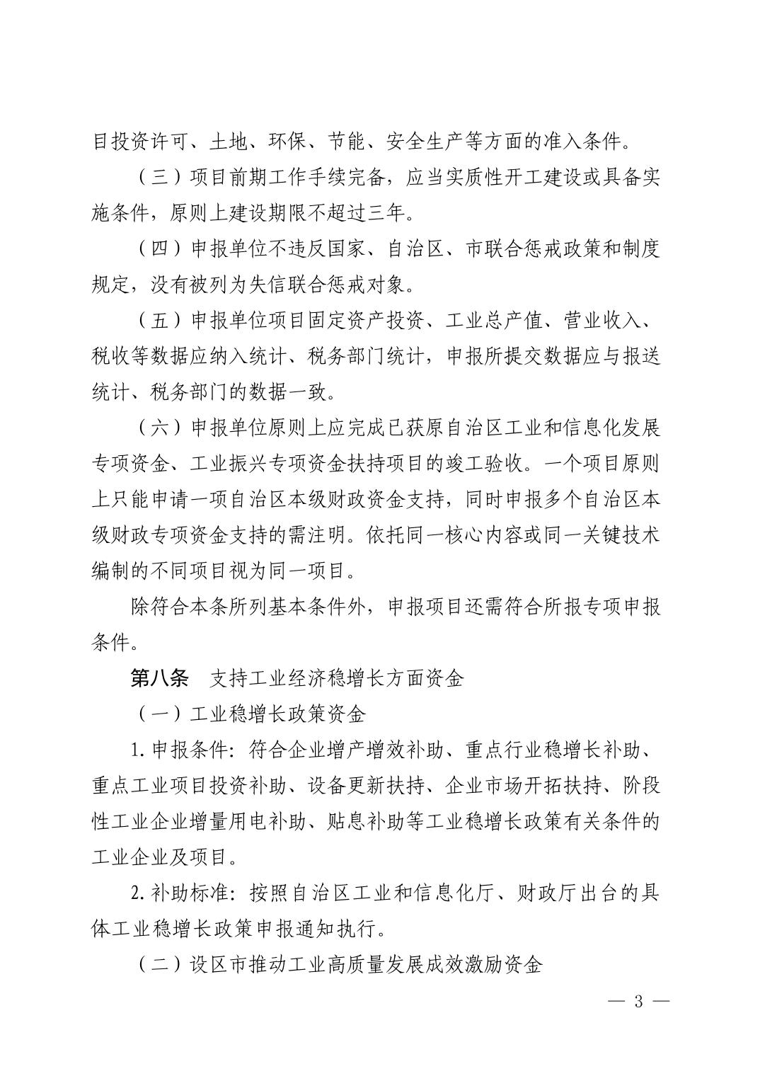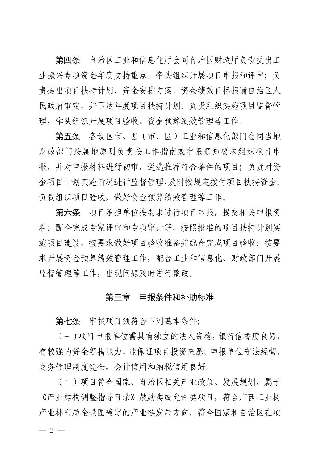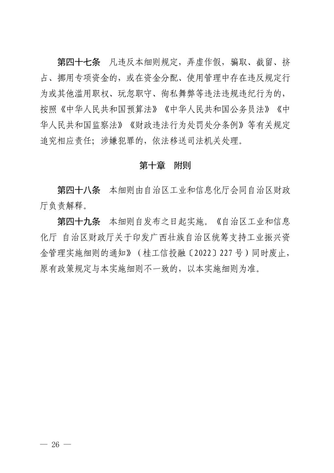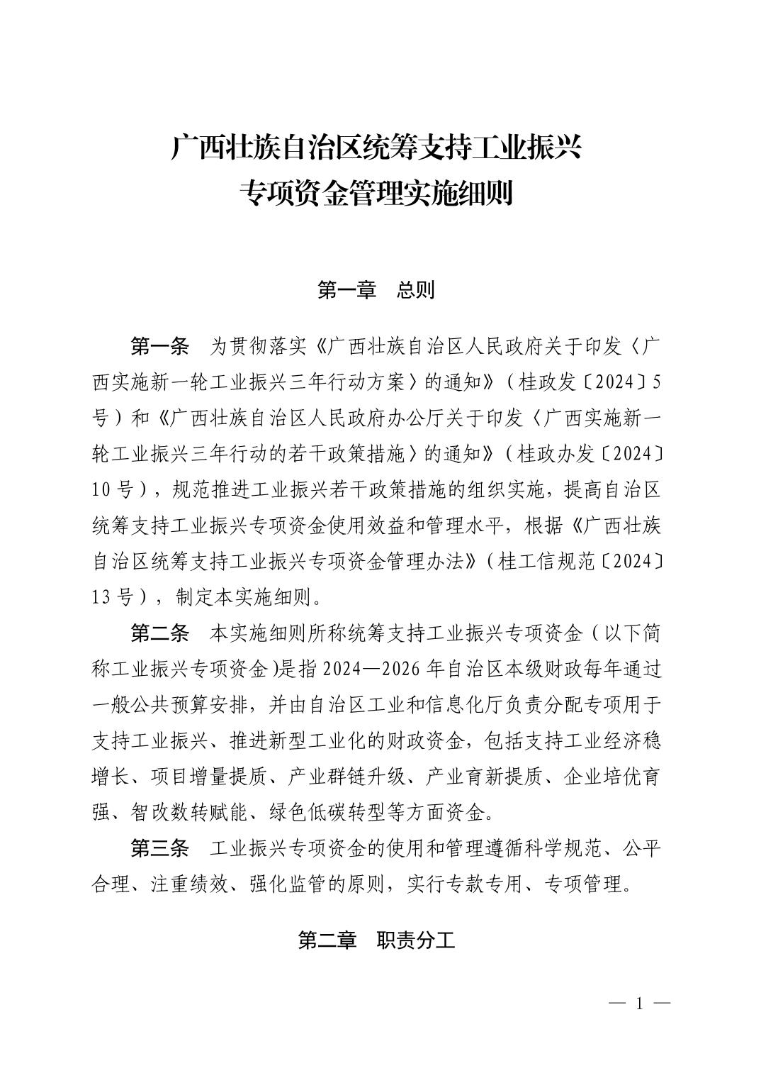 为进一步加强和规范自治区统筹支持工业振兴专项资金的管理,提高资金使用效益,根据《广西壮族自治区统筹支持工业振兴专项资金管理办法》(桂工信规范〔2024〕13号)精神,我们制定了《广西壮族自治区统筹支持工业振兴专项资金管理实施细则》。现印发你们,请认真贯彻执行。