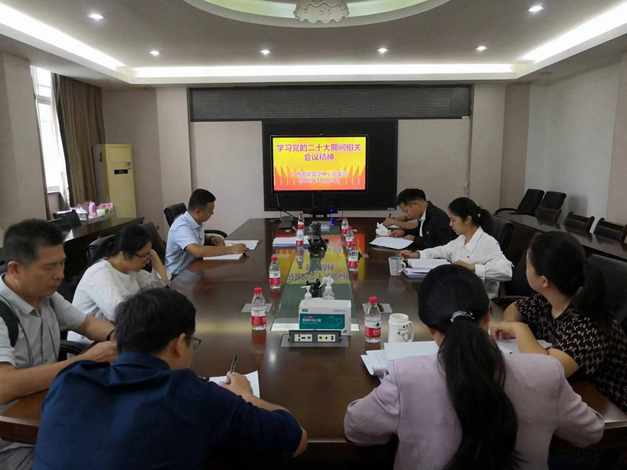 10月28日,广西节能监察中心党支部召开理论学习会,深入学习贯彻党的二十大精神和习近平总书记在参加党的二十大广西代表团讨论时的重要讲话精神,以及自治区党委常委会(扩大)会议精神、党的二十大广西代表团全体会议精神,中心党支部书记张显君主持会议。